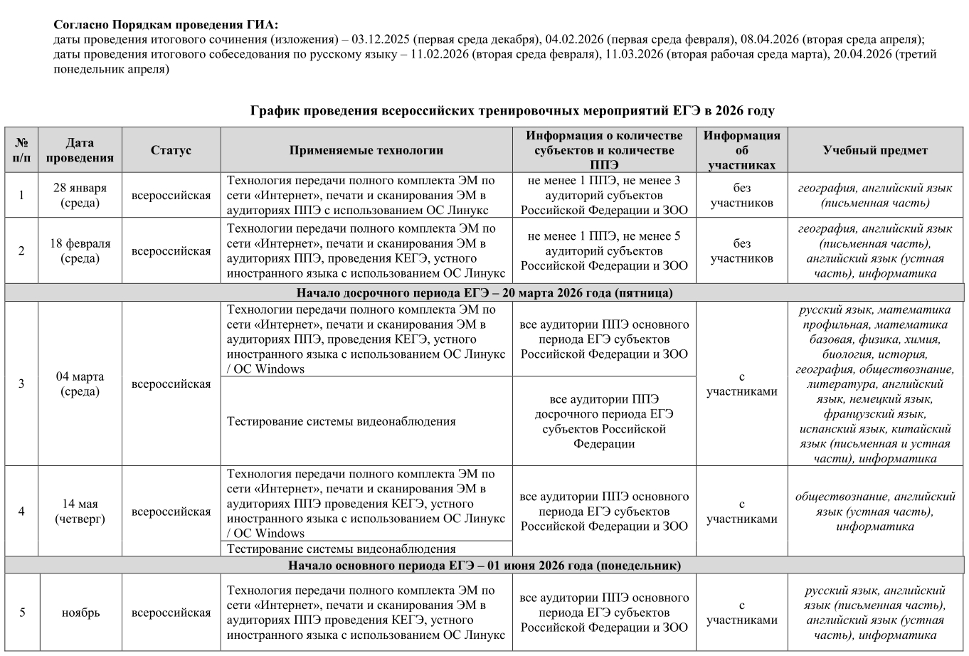 - Приказ Министерства просвещения Российской Федерации и Федеральной службы по надзору в сфере образования и науки от 7 ноября 2025 года № 798/1904 «Об утверждении единого расписания и продолжительности проведения единого государственного экзамена по каждому учебному предмету, требований к использованию средств обучения и воспитания при его проведении в 2026 году»